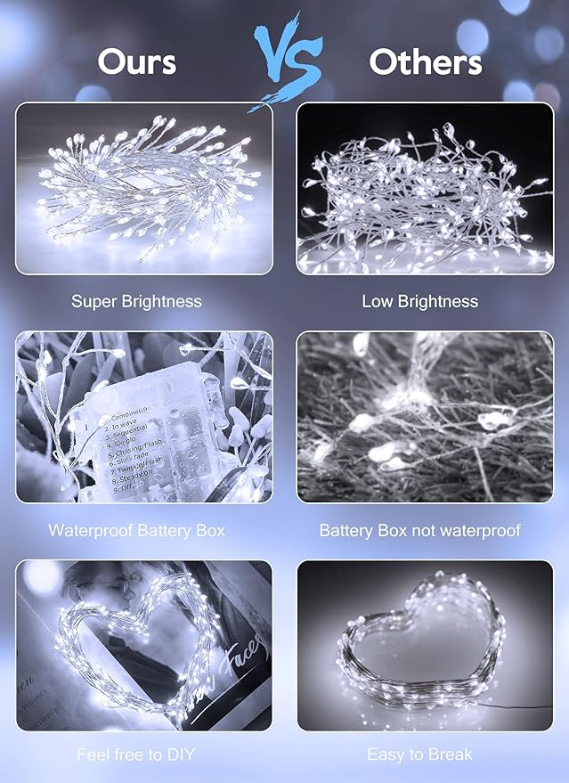 - 8 Lighting Modes: There are 8 different modes for the lights, including waves, sequential, slow glow, flashing, slow fade, twinkle, and combination, as well as standard on and off. It can be controlled by the button on the battery box. Lovely for your everyday decor as well as holiday decoration