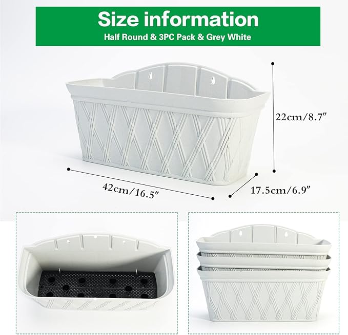 Sungmor 3 Pack Wall Hanging Planters, 16.5 Inch Railing Fence Hanging Flower Pots, Thickened Plastic Water Storage Plant Pot, Indoor Outdoor Garden Balcony Decor, Light Grey Large Plant Basket