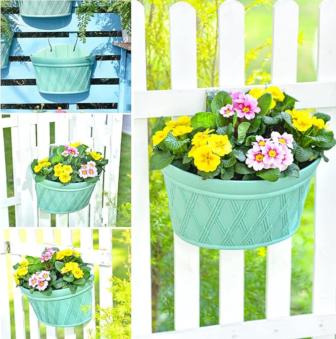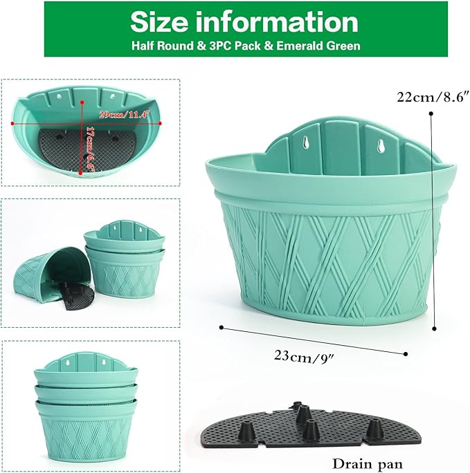 Sungmor Wall Hanging Planters,11.5 Inch Hanging Flower Pots for Railing Fence - Indoor Outdoor Balcony Wall Planter Hanging Basket, Plastic Pot Plant Container - Half Round & 3PC Pack & Green