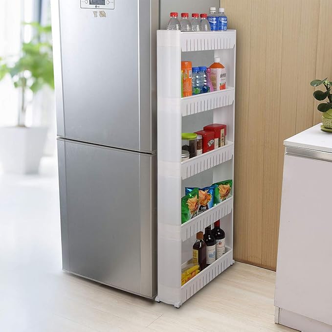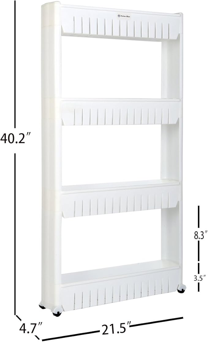 - CREATE ADDITIONAL STORAGE SPACE EASILY – This 4-tiered shelving unit organizer can be used ANYWHERE. The slim storage rack’s 4.75” design can fit an almost any narrow space. Ideal for closets, kitchens, bathrooms, garages, laundry rooms in homes, apartments and even offices.