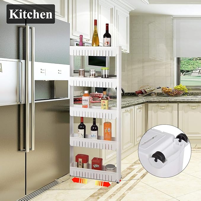 - 5 TIER SHELVING FOR MULTIPLE USES - This slim rolling storage cart organizer is perfect for the tiny space between your washer and dryer, or between your desk and wall, in closet, laundry room, nursery, corners, restrooms, bedrooms, washrooms, pantry, garage or under stairs, beside a table or wherever else you need some shelves.