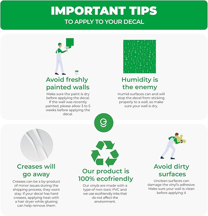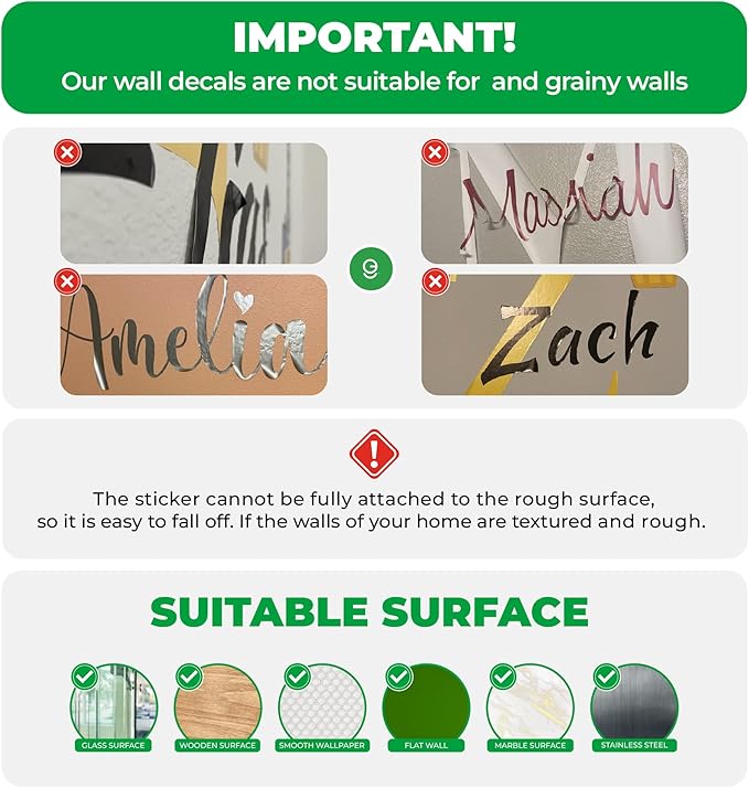 - IDEAL FOR FLAT SURFACES - Our wall decals are best suited for smooth and flat surfaces; We recommend applying them on glass, metal, and smooth walls, avoiding textured surfaces such as stone or brick walls