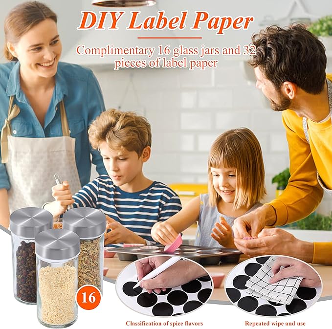 - 【Pre-printed & DIY Lable Stickers】The seasoning organizer is equipped with 144 pre-printed labels, 36 blank labels and a DIY white marker to label each spice. You can mark the seasonings and spices what you put on each glass bottle, which is convenient for you to identify and find.