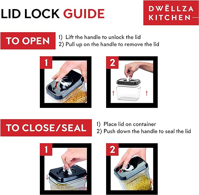 - Fresh Food: Keep your foods fresh with our kitchen essentials for new home easy to use canisters sets for the kitchen airtight lid-lock mechanism. No dealing with flimsy pumps. Our airtight containers for food storage create an airtight seal by simply pushing down the ring on the lid. Lift the ring and push up whenever you want to open the containers. The airtight seal is so secure you can store liquids without worrying about leaks!