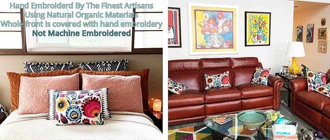 - ๐บ DAZZLING CHAIN STITCH DETAIL: Revel in the fabulous allure of our hand-embroidered suzani art nouveau floral accent pillow. The colorful design injects life into any transitional or modern-style home or office. Transform an old throw pillow or embellish a new pillow form, creating a unique farmhouse pillow that stands out. From patio to living room, den to bedroom, study to kids room, these eye-catching floral art pillows refresh your home decor with their dazzling chain-stitch hand embroider