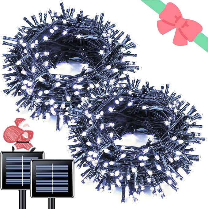 - Blend-in Design & Widely use: Our green wire is close to the color of plants: solar Christmas lights blend in to any plant backgrounds! Moreover, there are 2 sets of solar Christmas lights, each contains 100 LEDs. Suitable for decorating small scenes such as windows, fences, balconies and 5ft Christmas trees. More surprisingly, the 9.9ft long lead allows a large range to place the solar panel at a sunny spot to charge. Therefore, you can use the lights indoors