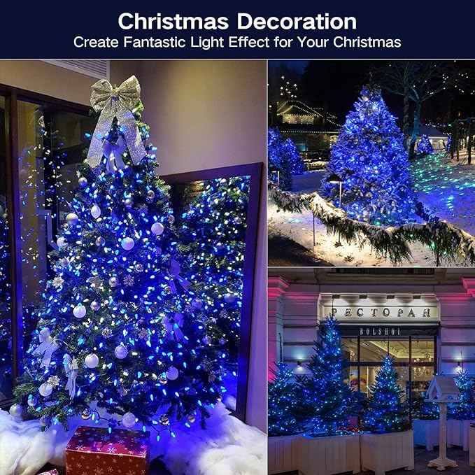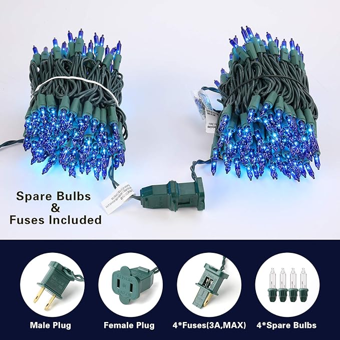 - 300 Counts Blue Mini Lights: Old-fashion Blue incandescent Christmas light set, creates a festive atmosphere, celebrates Christmas, New Year, Birthdays and special holidays, cast a magical look to your house and garden, and impress your family friends, and relatives with this easy to set up!