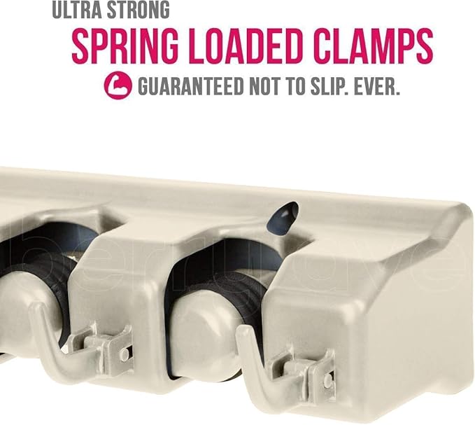- NO SLIDE, NO MESS – Each commercial grade broom hanger has a 35 pound holding capacity. Thanks to the spring loaded, double rubber gripped slots, the Berry Ave utility hooks can hold anything from wet mops and dirty rakes to baseball bats, without any annoying slipping.