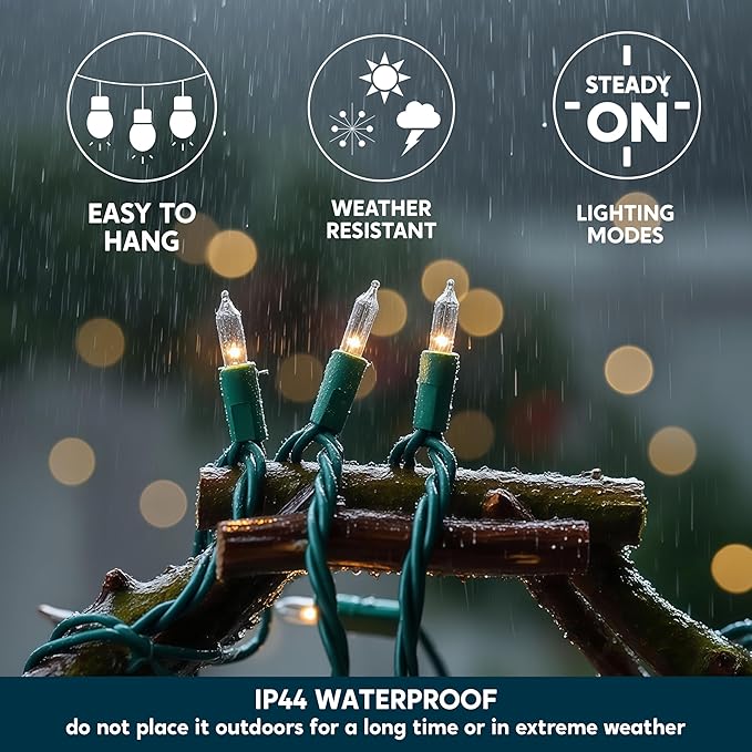 - UL588 CERTIFIED FOR INDOOR & OUTDOOR SAFETY - Ensure holiday peace of mind with our string lights, rigorously tested to meet US UL safety standards. The IP44 waterproof design and durable construction withstand rain and snow, making them perfect for Christmas tree decorations, garden, patio, and year-round use.