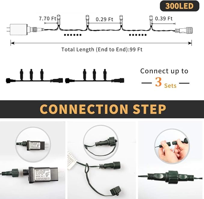 - 105FT/300LED & End to End Expandable:This super long 105FT fairy string lights with 300LED warm white individual bulbs. And each Christmas light has end-to-end connection that allows up to 3 strands connected together to illuminate a wider range. They will brighten up the dark corner for happiness atmosphere inside or outside.