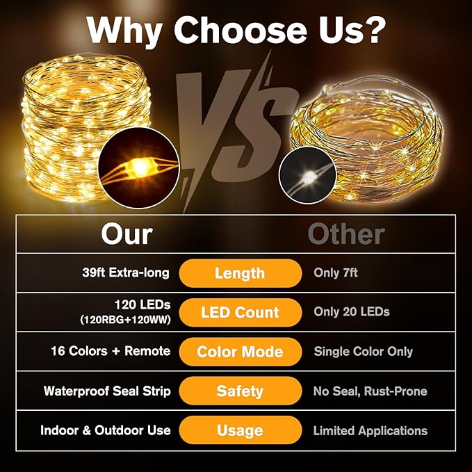 - 【39Ft, 120 Led, 16 Vibrant colors】Compared to other single color fairy lights on the market, we made it 39 ft with 120 Leds, 16 colors, which is more useful and cost-effective. Use the remote control or press the button on the battery case to switch different colors like warm white, red, green, blue, orange, purple etc to create ideal ambience in special events and occasions. LED Bulb Size: 8.55mm*5.0mm