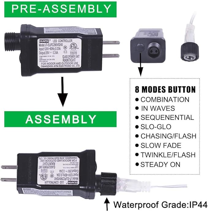 - 8Modes and easy to use:modes including combination, in waves, sequential, slogs, chasing/ flash, slow fade, twinkle/ flash, and steady on. Just use the plug button to adjust 8 modes setting .directly plug in and unplug it for power on and off.