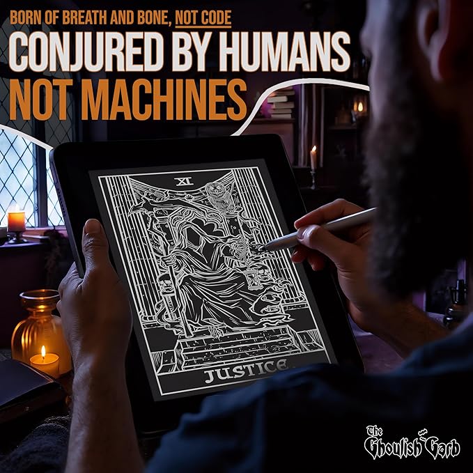 - โณ Features a Monochromatic, Ghoulish Rendition of the Major Arcana Tarot Card, Justice