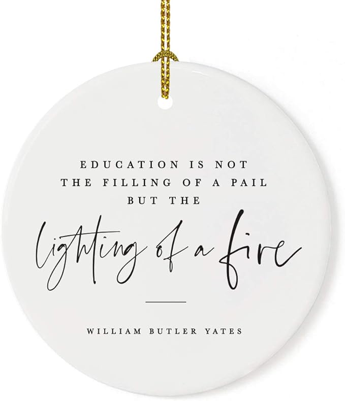 Andaz Press Round Ceramic Porcelain Christmas Tree Ornament for Teacher Thank You Appreciation Graduation Gift, Education is Not The of a Pail But The Lighting of a Fire, William Butler Yeats, 1-Pack