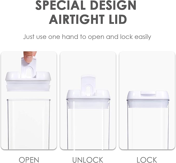 - keep food dry and fresh----With special sealing mechanism, you can open or close our plastic containers safely by using only two fingers. Simply flip the ring to open or flip the ring down to lock and seal. Airtight dry storage system will always keep things fresh. Please do not place in dishwasher.