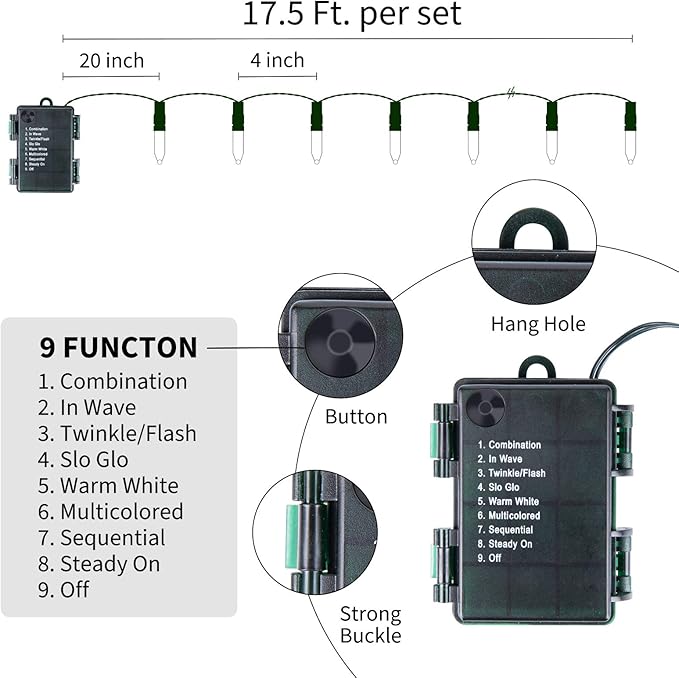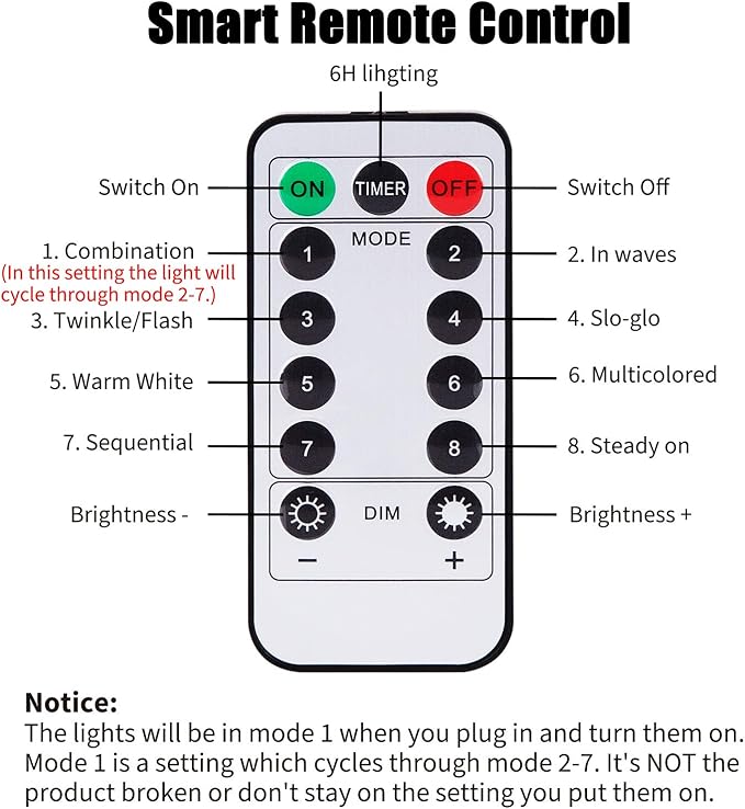 - 8 Lighting Modes: There is 8 various fantastic lighting effects for adaptable occasions or events: press the button on control box repeatedly to select 1.combination, 2.in wave, 3.twinkle or flash, 4.slow glow, 5.warm white, 6.multicolored, 7. sequential or 8.steady on