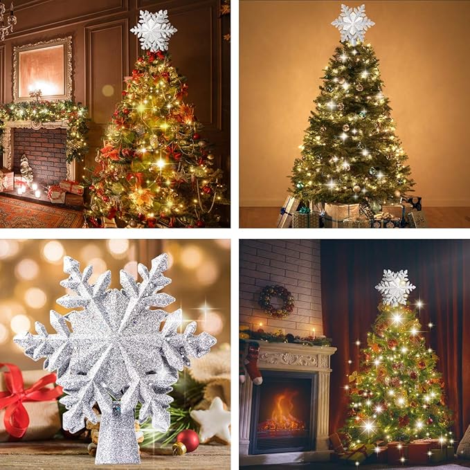 - Silver Christmas decorations, this Christmas tree topper built-in snowflake projector lamp,bring movable snowflakes to your ceiling, your ceiling will be filled with large, clear snowflakes.
