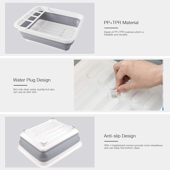 - 【Food Grade Material】Made from eco-friendly PP+TPR material that is BPA Free and Food-Grade. The flexible material allows the dish strainers for kitchen counter to collapse flat for easy space-saving and storage, making the most of your kitchen countertop.