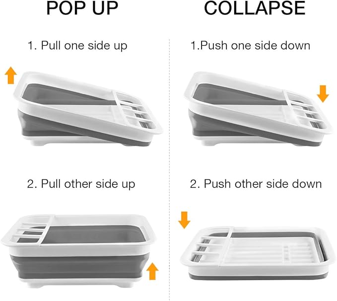 - 【Compact and Portable】The collapsible dish drainer is simply pop-up to open when using and collapses to flat for space-saving storage, you can easily store it under the sink or slip it into any cabinet. Suitable for both indoors & outdoors uses, such as camping, BBQ, RV and boats, campsite cleanup, and vacation homes, etc.