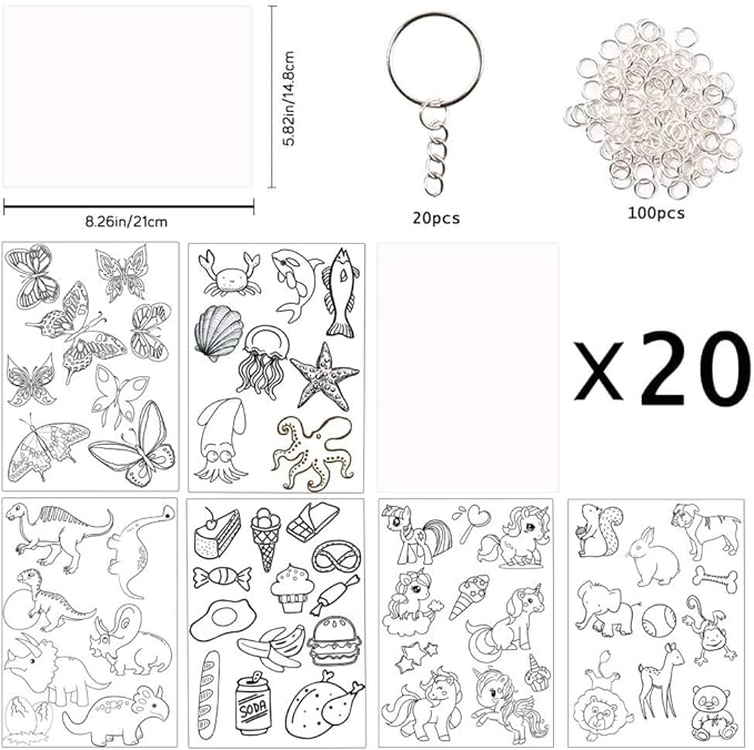 - 【QUALITY MATERIALS】Our shrink plastic sheets are crafted from high-quality materials that shrink uniformly and maintain vibrant colors. They shrink to about 20% of their original size, resulting in sturdy, thicker forms that retain their initial color and shape. The keychains and open iron rings are robust and durable, ensuring your child's masterpieces last for years to come.