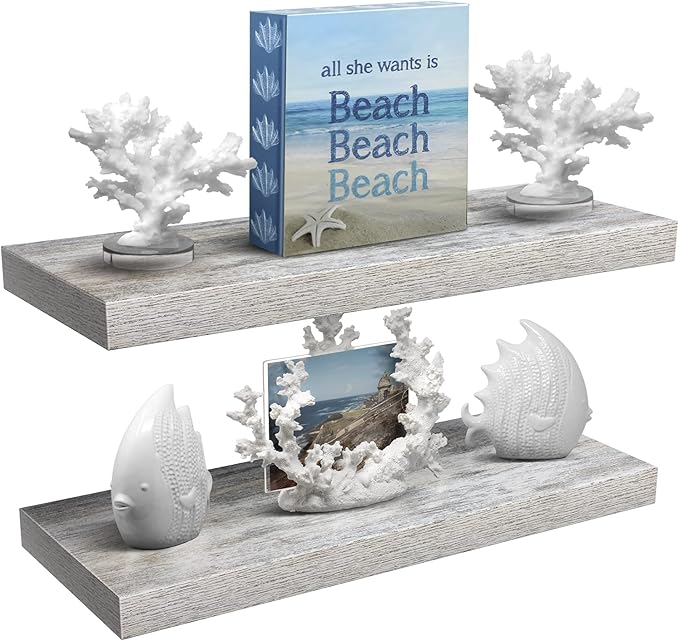 - Rustic White Floating Shelves for Wall Storage: 2 Pack 24 X 9 Inch Floating Shelves - Display charming showpieces for beach decor, coastal decor or home decor items, and other prized possessions while offering functional wall bookshelf, book shelf or bathroom shelf storage. Our beach bathroom decor shelf Measures approximately 24" L X 9" W 1.50" thick - The shelf colors might be a bit different from the pictures due to the different lighting and screen settings