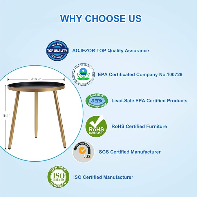 AOJEZOR Side Table: End Table for Any Room - Round Side Tables for Small Spaces - Black Top with 3 Gold Legged