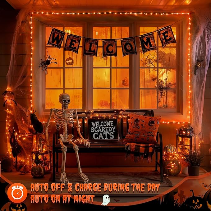 - 【IP44 Waterproof Halloween Lights Outdoor】Both the copper wire and the solar panel are IP44 Waterproof, they withstand all kinds of weather, including heavy rain and snow. Solar Halloween string lights are suitable for both indoor and outdoor usage without any worry of short circuits or weather damage.
