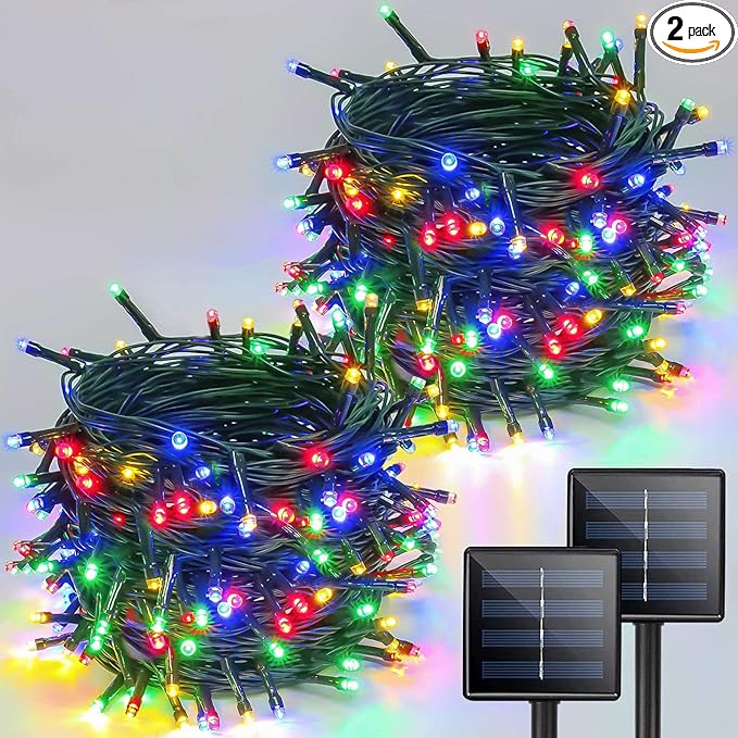 - Upgraded Multicolored Solar String Lights on Green Wire: The solar Christmas lights are upgraded in 2025 with brighter LED and higher charging efficiency solar panel. Each string is 200 LEDs with a length of 72ft (66FT plus 6FT leading wire. Total 2pcs per set (144 FT and 400 LEDs)