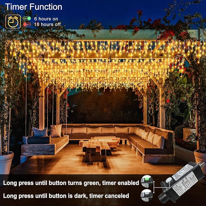 - Memory and Timer Function: The icicle Christmas lights outdoor could recover from the previous setting mode when you restart, no need to reset the mode every time. Press and hold the button on the adapter for 3 seconds until the green light on, then the timer function start, 6 hours on 18 hours off. This smart and convenient outdoor Christmas lights for house is the best choice for your holiday decoration.