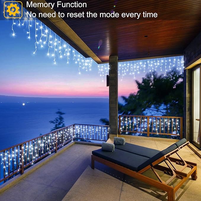- Upgraded 8 Modes Icicle Lights for Outside: The Christmas Lights outdoor have 8 selections of light pattern: 1.Combination 2.In Waves 3.Sequential 4.Slo-Glo 5.Chasing/Flash 6.Slow Fade 7.Twinkle/Flash 8.Steady On. Different lighting effects are controlled by the button on the plug. These beautiful and vibrant white Christmas lights will bring you a lot of festive atmosphere.