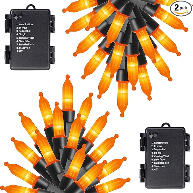 Joliyoou 16 Ft 50 LEDs Halloween Mini String Lights, 8 Lighting Modes Holiday Fairy String Lights with Timer for Indoor Outdoor Decorations, Orange, 2 Pack