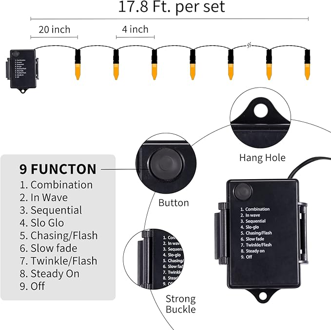 - 8 Preset Modes: Fantastic lighting effects of this Halloween lights, adapting to desired occasions or events: press the button on control box repeatedly to select 1.combination, 2.in wave, 3.sequential, 4.slow-glow, 5.chasing/flash, 6.slow fade, 7.twinkle/flash or 8.steady on