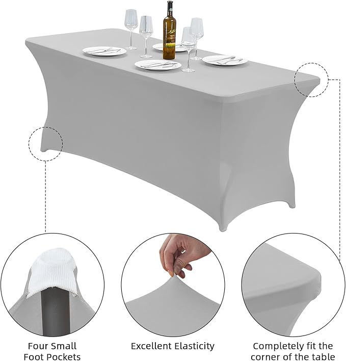 CWK 6FT Waterproof Stretch Spandex Table Cover for Rectangular Tables - Elastic Fitted Tablecloth for Folding Tables,Wrinkle Resistant Table Cloth for Parties, Weddings, Banquets & Events (Silver)