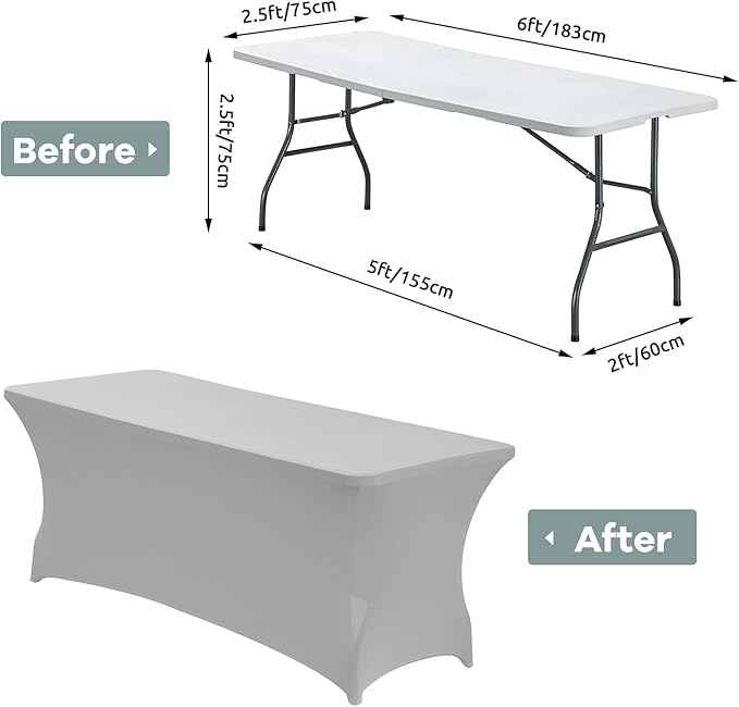 - [Dimensions]:The 6 foot tablecloth fits tables that are 72" Length X 30" Width X 30" Height; It is always fitted and tight for Standard Folding Tables-Universal Rectangular Fitted Tablecloth Protector