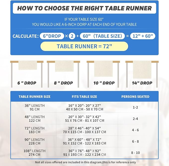 - Fits Table Size : This table runner is 13 x 90 inch, appropriate for a table that can seat 6-8 people, better match your table and give you a delightful dining experience