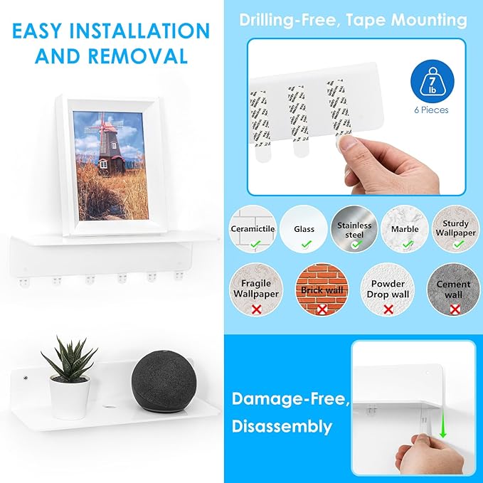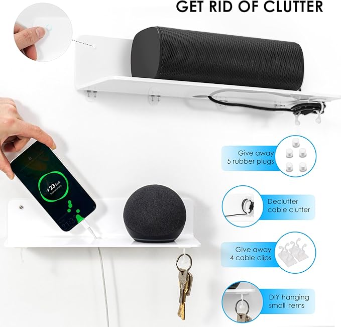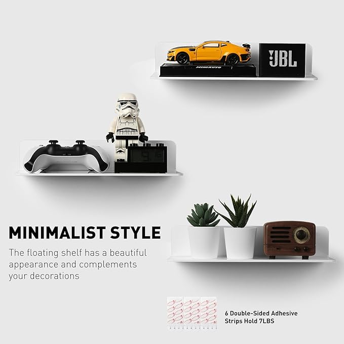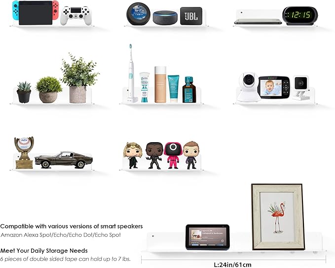 - DURABLE & STRONG: The white acrylic shelves are made of high-quality acrylic, exquisite workmanship, durable and strong enough to hold up to 7 pounds. Convenient and non-damaging storage for items such as cosmetics, smart speakers, baby monitors, action figures, and more.
