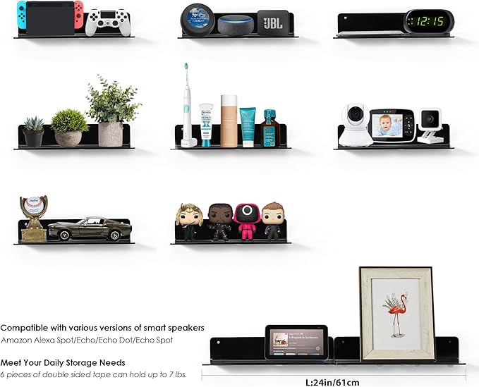 - DURABLE & STRONG: The black acrylic shelves are made of high-quality acrylic, exquisite workmanship, durable and strong enough to hold up to 7 pounds. Convenient and non-damaging storage for items such as cosmetics, smart speakers, baby monitors, action figures, and more.