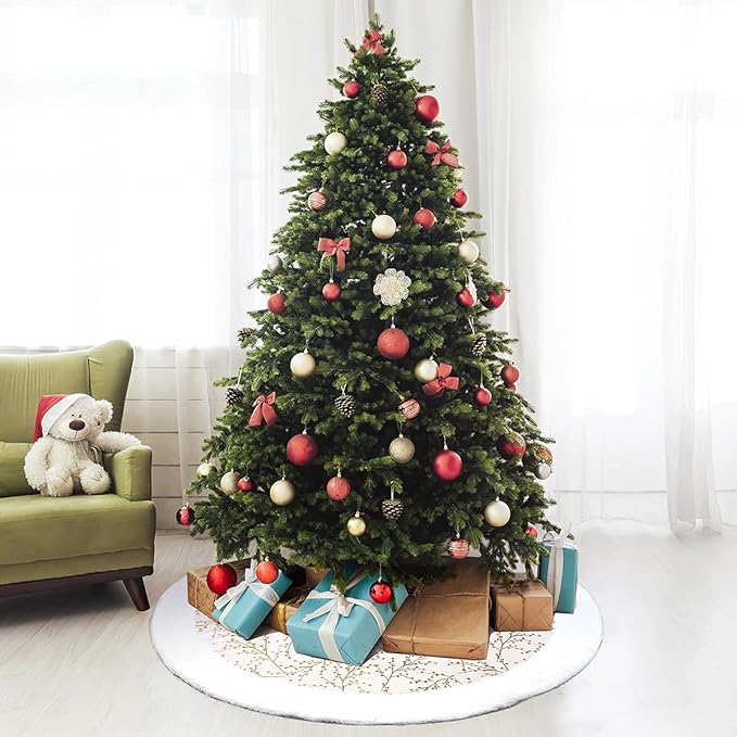 - Unique & Classic Design - The shining champagne golden holly berry branches pattern is different from ordinary white snowflakes pattern, which makes Christmas tree skirts unique and gorgeous. Snowy white and Luxury gold texture make your Christmas tree more attractive and outstanding.