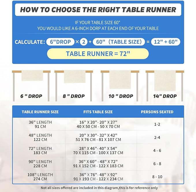 - Fits Table Size : This table runner is 13 x 72 inch, appropriate for a table that can seat 4-6 people, better match your table and give you a delightful dining experience