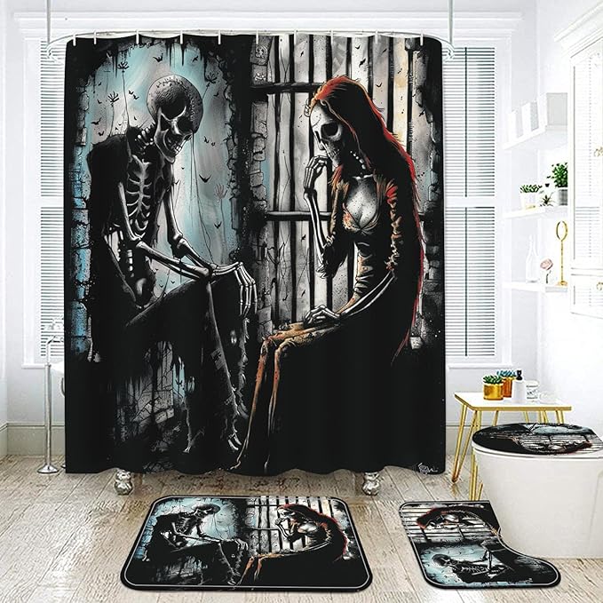 NEWSUYAA Halloween Decorations Shower Curtain Set with Non-Slip Rugs and Bath Mats,Black Skull Skeleton Bathtub Curtains with 12 Hooks,All Saints'Day (Nov 1st) Bathroom Decor
