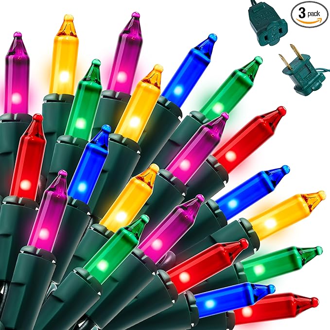 - SUPER VALUE PACK. Our Christmas lights include 3 sets of colorful Christmas lights with 150 lights.Each set has 31.2 feet wire length and 29.3 ft lighted length with 3 inch light spacing.Come with 9 extra bulbs & 3 replacement fuses & 9 testing flasher bulbs total. Conventional household power supply ac 120 volts 61.2 watts. 3 sets can be connected end to end.