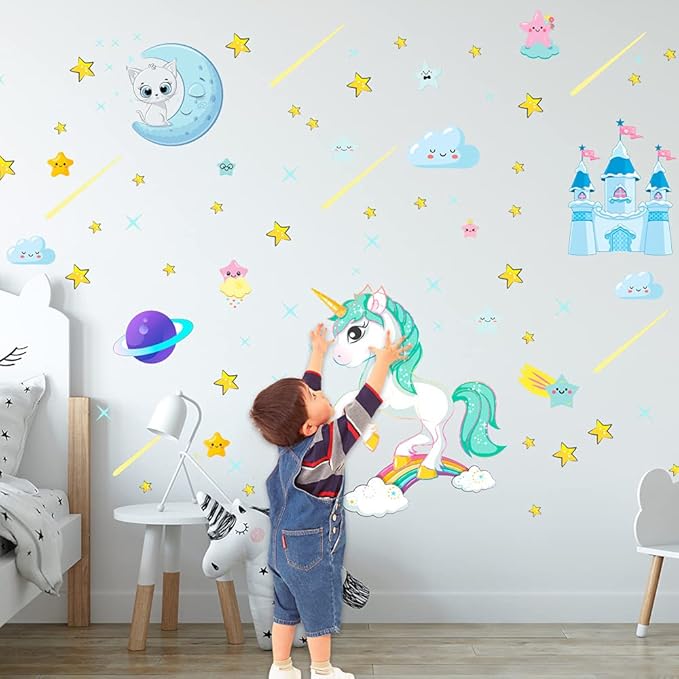Glow in The Dark Unicorn Stickers, 206 pcs Cats and Moon Wall Decals, Glowing Castle Clouds Ceiling Decor for Kids Bedroom, Stars and Rainbow Wall Decor for Girls and Boys Gift