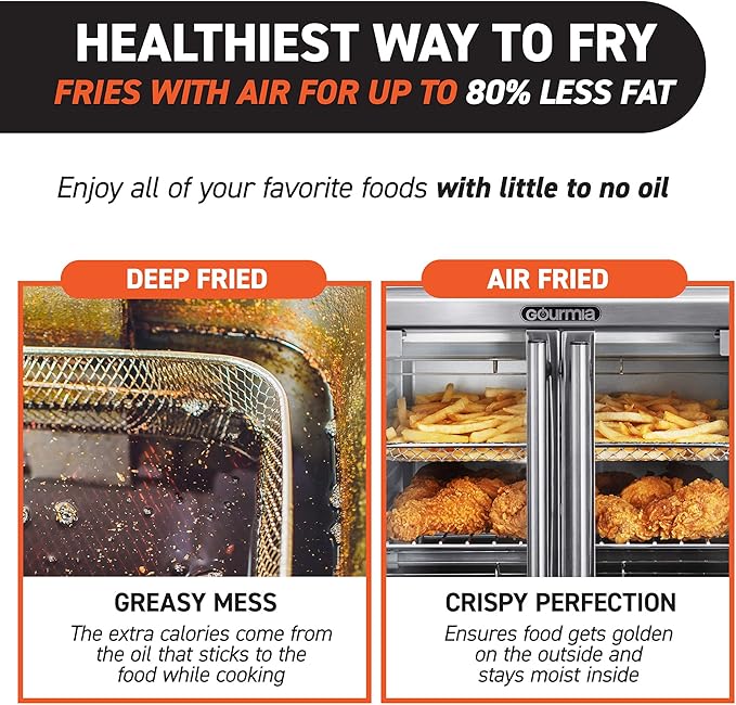 Gourmia Toaster Oven Air Fryer Combo 17 cooking presets 1700W french door digital air fryer oven 24L capacity accessories, convection rack, baking pan tray recipe book GTF7655,Large,Stainless Steel