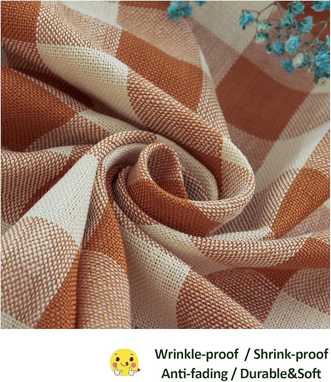 - * #1, DESIGN OF THE CHECKERED RECTANGLE TABLECLOTH # Features the classic buffalo check pattern in orange and white to create the best farmhouse look, edged in jaunty tassels for a refined finish and playful touch to your decor! Rustic in appearance that suits farmhouse, rustic, or modern decor styles, and will instantly lift the mood of anyone who comes to eat with you.