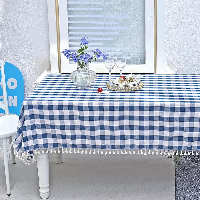 - * #1, DESIGN OF THE CHECKERED RECTANGLE TABLECLOTH # Features the classic buffalo check pattern in navy blue and white to create the best farmhouse look, edged in jaunty tassels for a refined finish and playful touch to your decor! Rustic in appearance that suits farmhouse, rustic, or modern decor styles, and will instantly lift the mood of anyone who comes to eat with you.