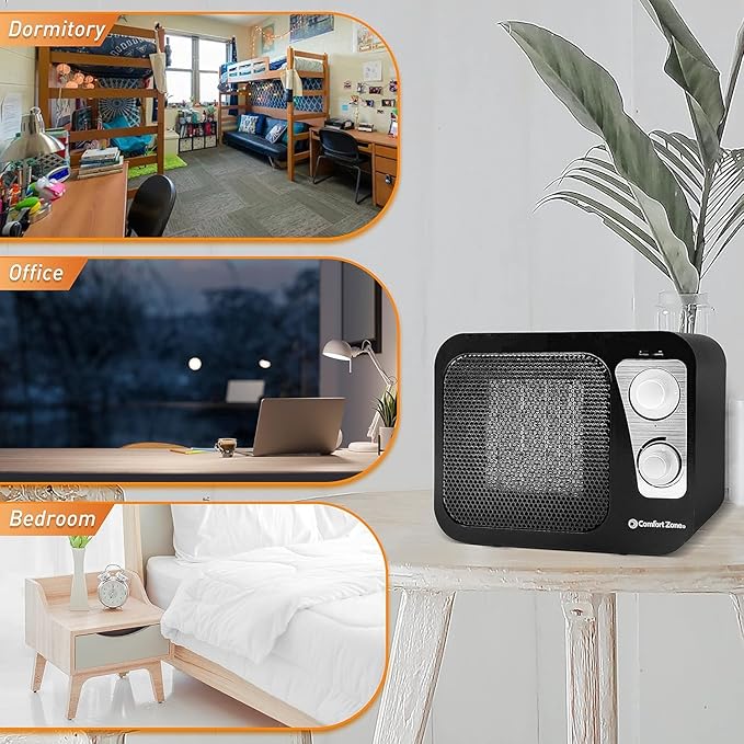Comfort Zone Space Heaters for Indoor Use, Portable Heater, Fast Heating, Electric Heater, Thermostat, Retro Design, Bedroom Heater with Overheat Protection, Safety Tip-Over Switch 1,500W, Black