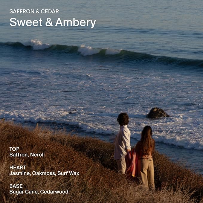 - Saffron & Cedar — This scent is warm, complex, and delicately sweet. It’s like taking a drive up the Pacific Coast where the ocean meets mountains.