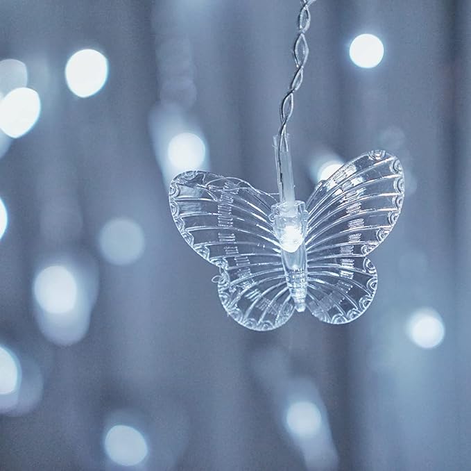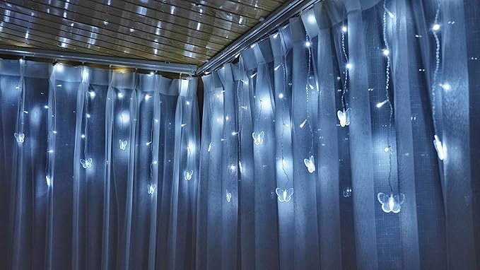 - Butterfly Curtain String Lights -- 11.5ft 4.5M/14.7FT horizontal length, and 16 vertical strings with a butterfly end each, total 96 LED lights. The delicate crystal butterfly is very transparent with colorful light. It is delicate and romantic.