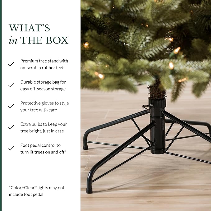 - Complete Kit with Foot Pedal Control: This pre-lit artificial christmas tree includes premium christmas tree stand with scratch-proof feet, protective gloves, christmas tree storage bag, convenient foot pedal for effortless tree lights control, plus extra bulbs - comprehensive artificial tree accessories deliver a great value by eliminating separate christmas decor purchases