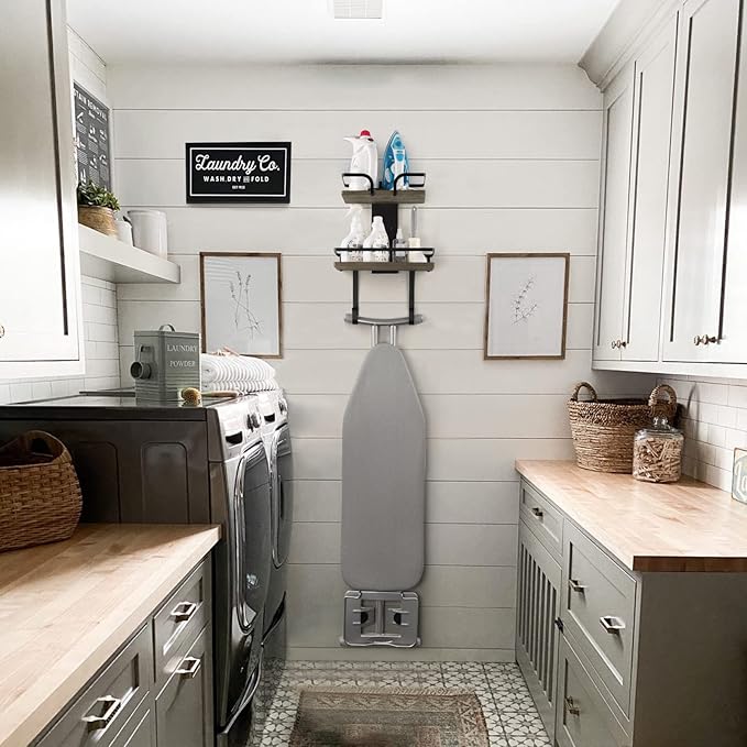 - 【Functional & Versatile】 Apart from the ironing board and the iron, you can store various types of items on the shelves. This holder is also suitable for utility room, sewing room, bathroom, kitchen, or bedroom to keep everyday stuff organized and accessible.